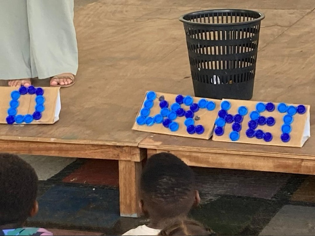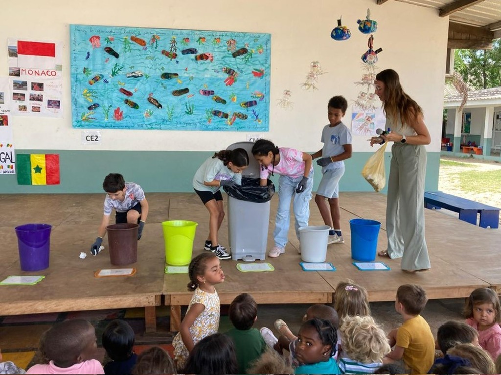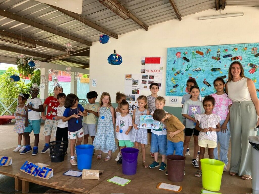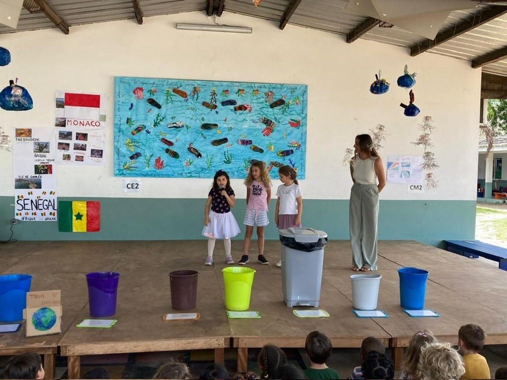 En préambule, les élèves de CP, CE1 et CE2 ont présenté leurs productions réalisées en mode "upcycling"! (poissons confectionnés à partir de tongs récupérées sur la plage de Liambissi, superbes méduses à partir de bouteilles plastiques et de magnifiques planètes réalisées avec des journaux anciens).